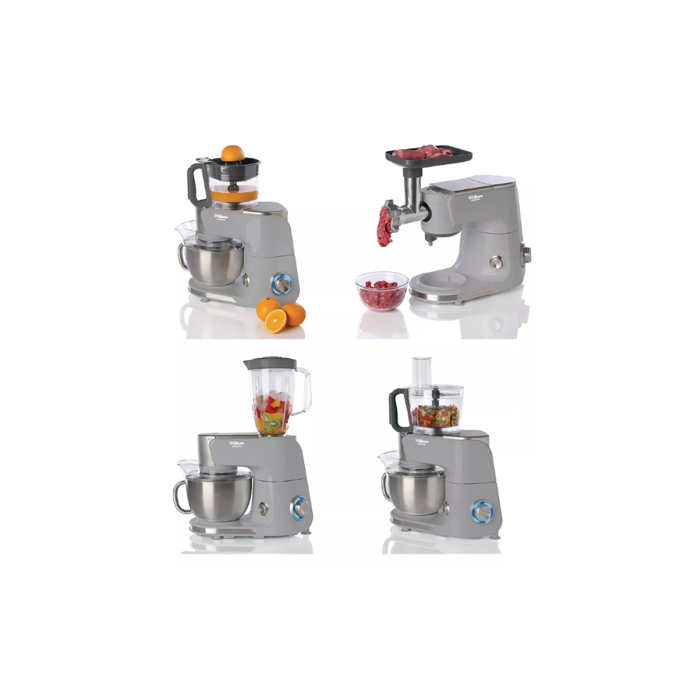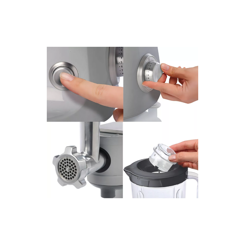 La batidora Liliana AB700 incluye accesorios y es multifunción: Bate, amasa, pica, ralla, rebana, exprime, licúa y pica carne. A su vez, tiene regulador electrónico de potencia y 8 velocidades más pulsador.