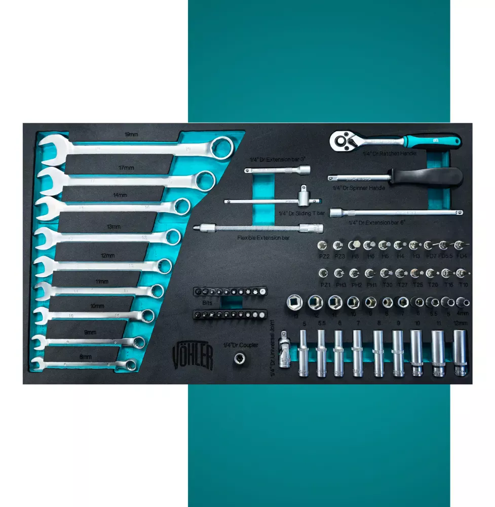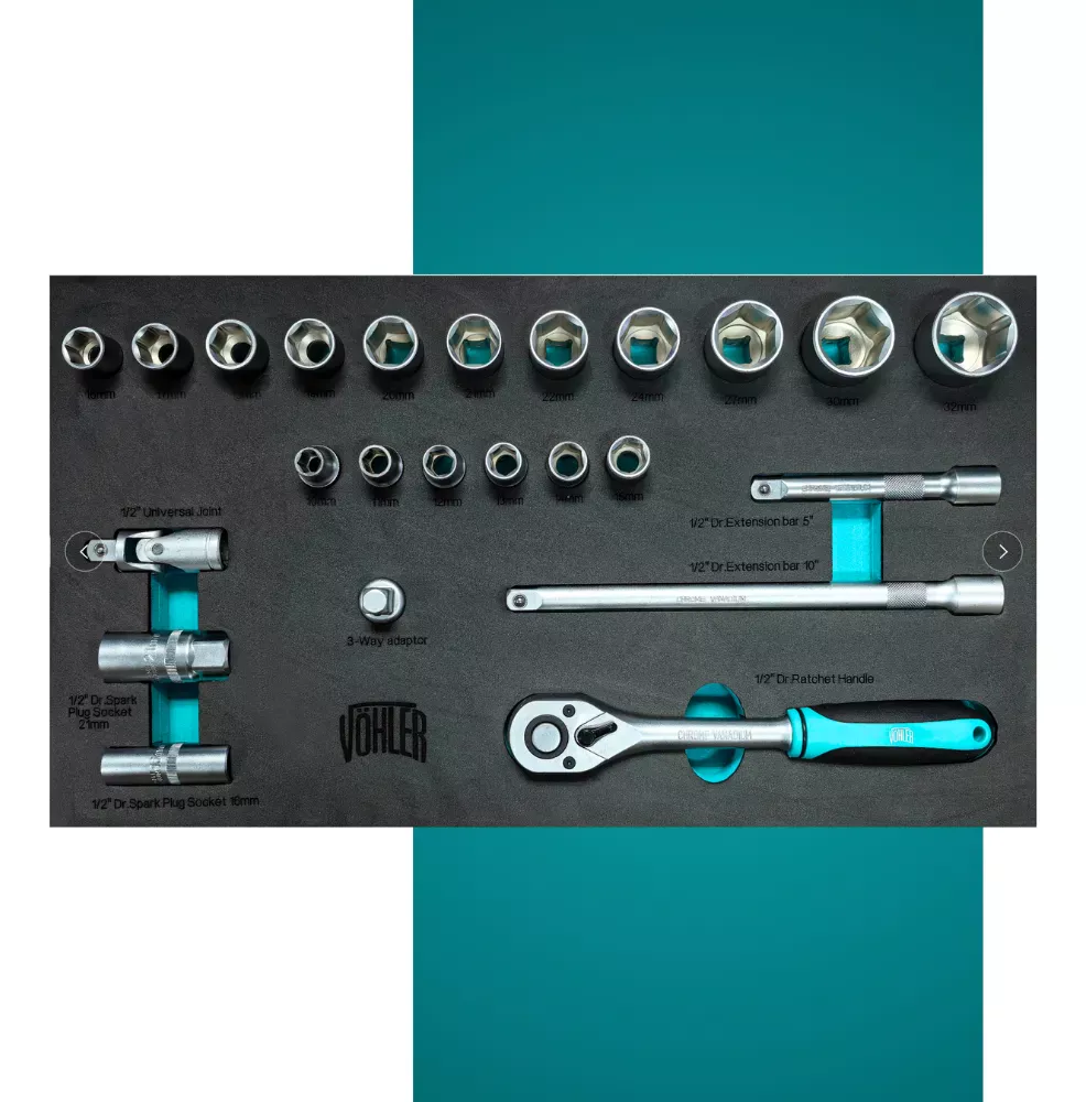 Este completo gabinete metálico VÖHLER viene equipado con 101 piezas, organizadas en bandejas de espuma de alta densidad. Fabricadas en acero Cromo Vanadio (Cr-V), ofrecen resistencia, durabilidad y un rendimiento confiable para talleres, mecánicos y usuarios exigentes.