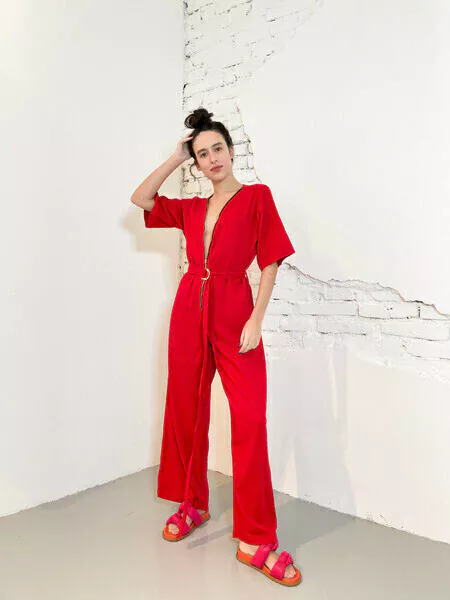 Confeccionado en 100% viscosa, este modelo combina comodidad y estilo en un solo diseño. La correa ajustable con lazo en la parte posterior permite un ajuste personalizado, mientras que el elástico en la cintura asegura un ajuste perfecto y cómodo. Los elásticos en los costados del busto brindan mayor seguridad y soporte, sin sacrificar la libertad de movimiento. Las piernas anchas aportan un toque de elegancia y frescura, convirtiéndolo en la opción ideal para cualquier ocasión.