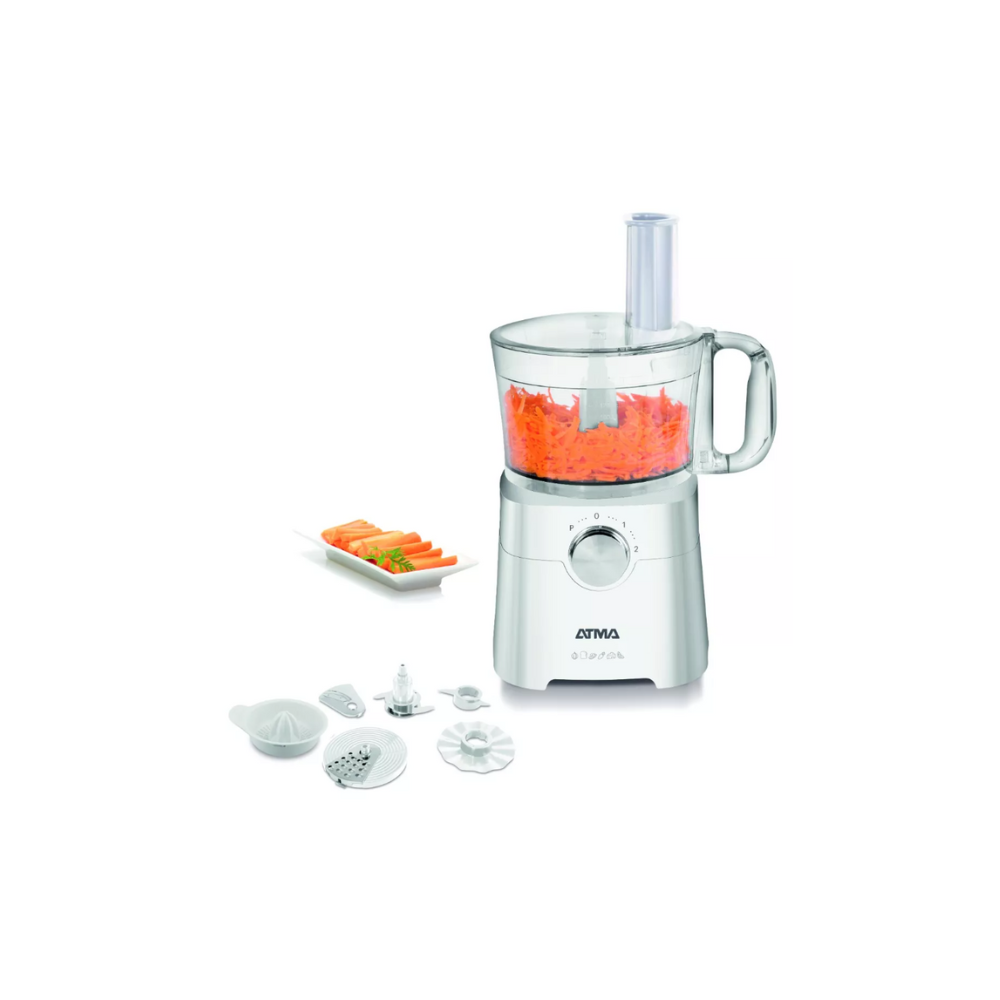 La multiprocesadora ATMA MP8405P posee una capacidad de 1,2 litros. Cuenta con una potencia de 650 watts, dos velocidades y pulsador.